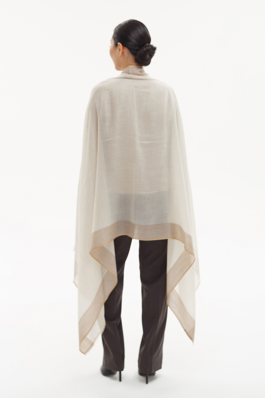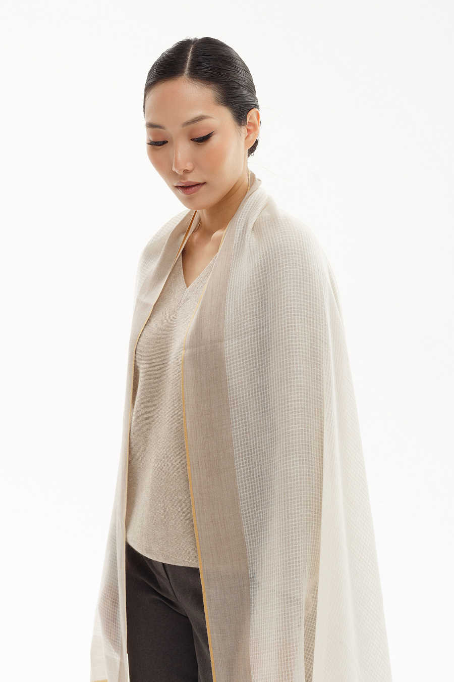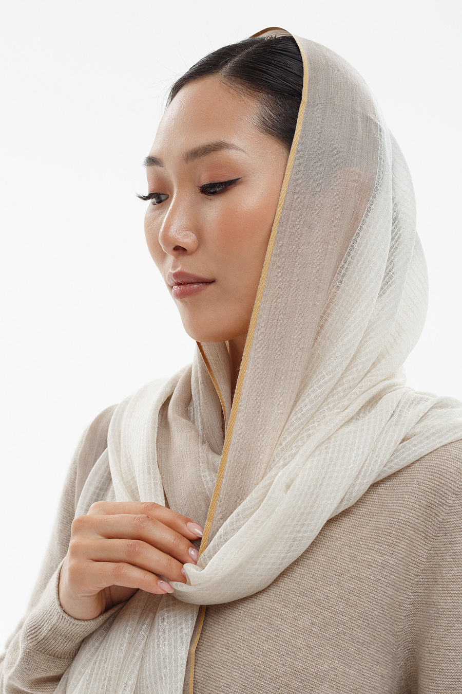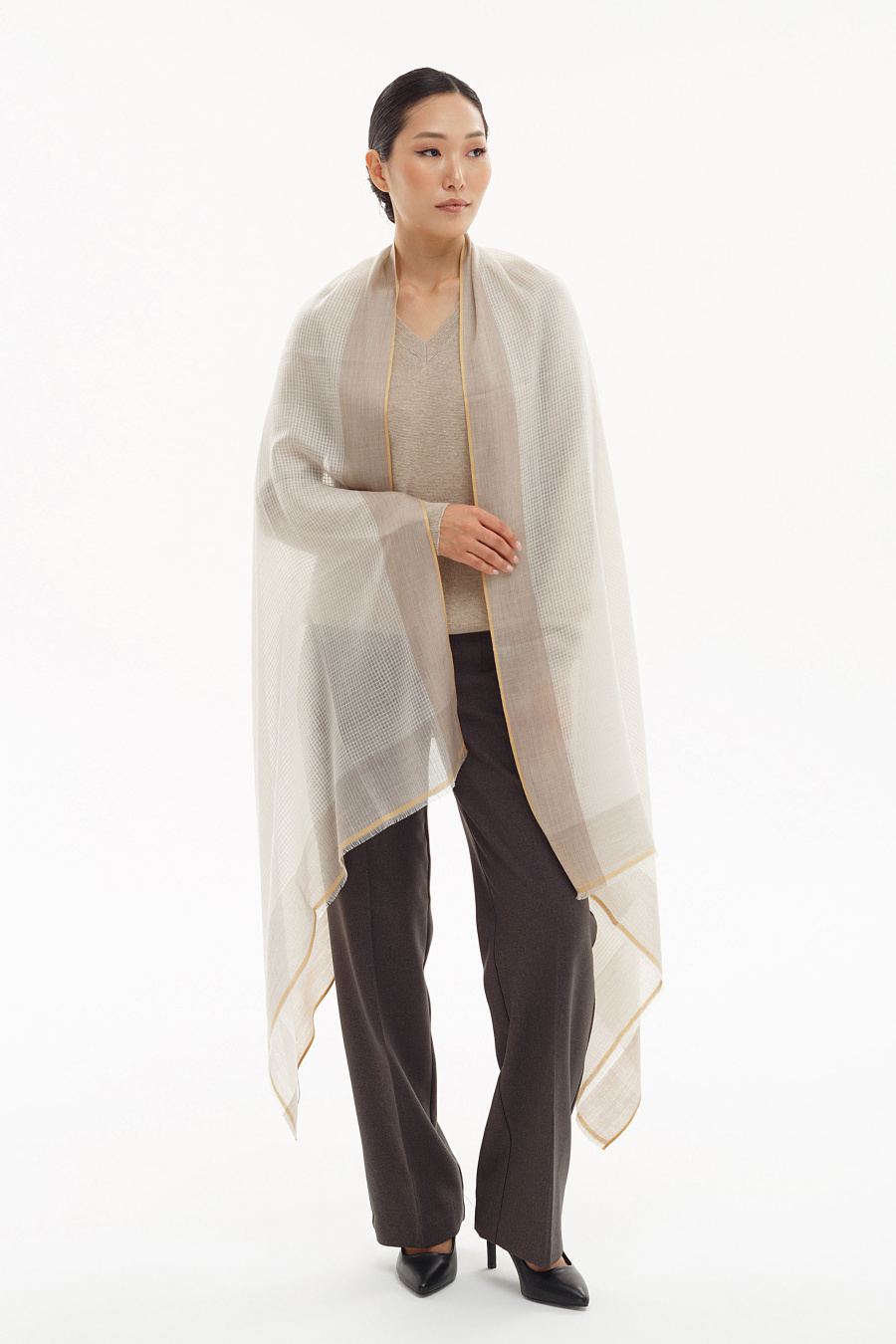 Многоцветное переплетение оттенков бежевого, коричневого и жёлтая кайма по краю создают сложную, но ненавязчивую игру цвета, которая оживит любую монохромную палитру вашего гардероба.
