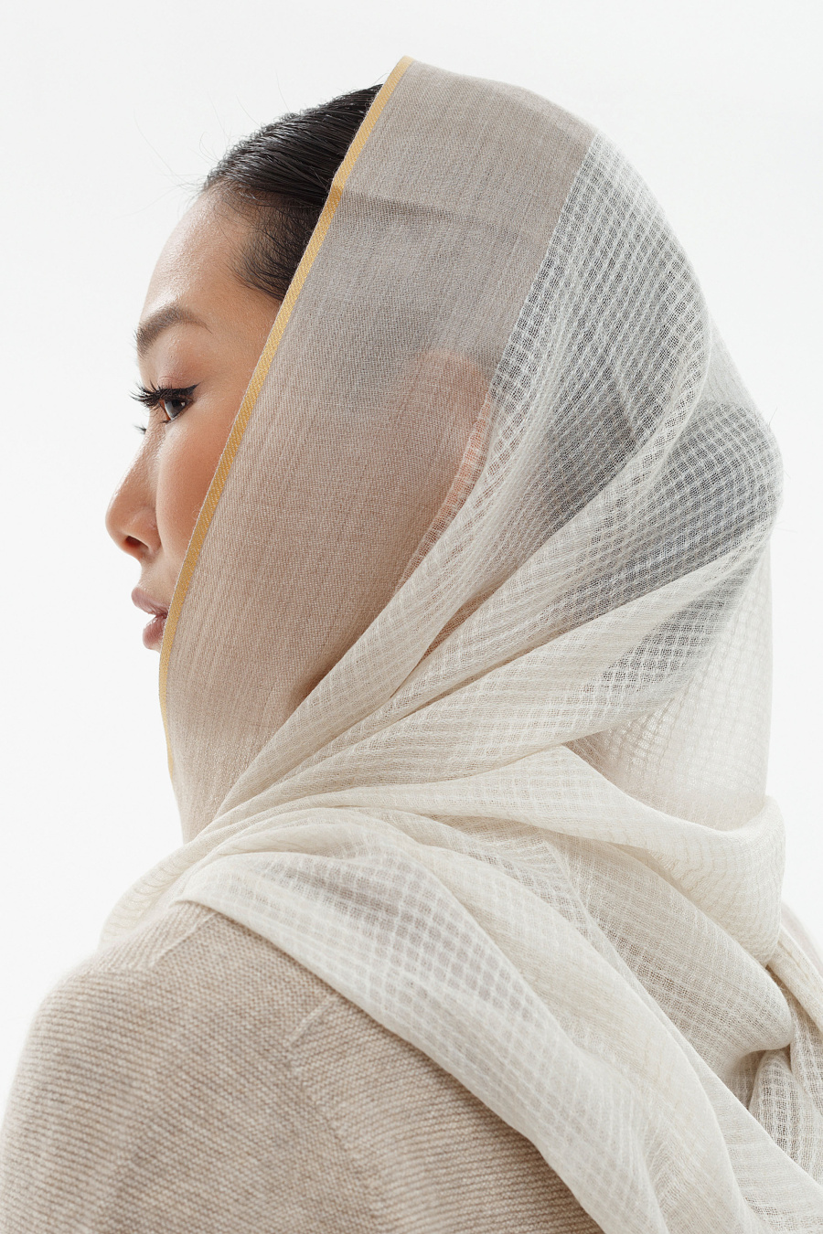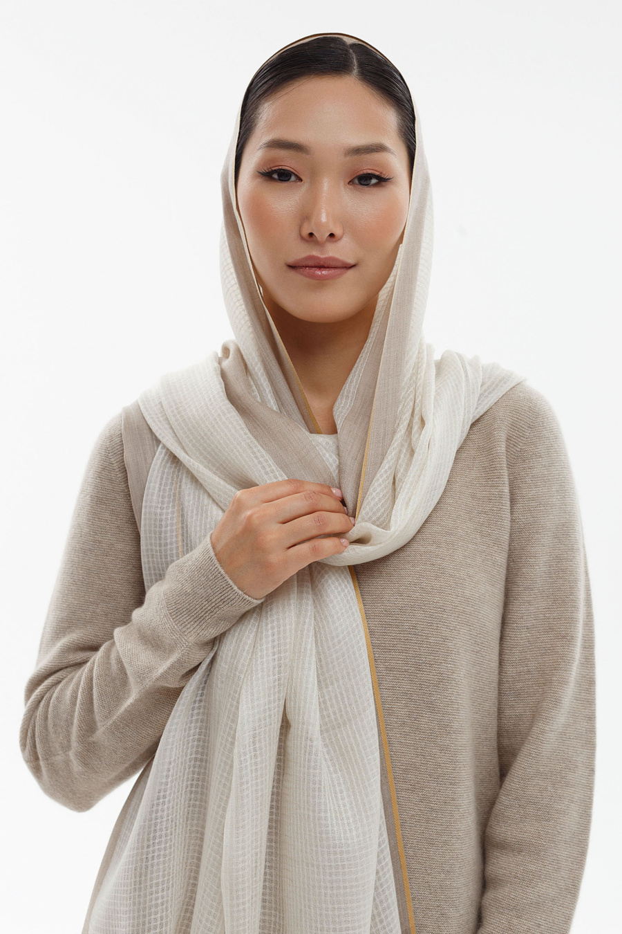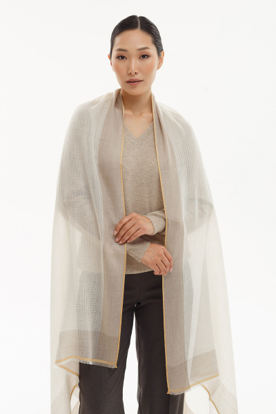 Многоцветное переплетение оттенков бежевого, коричневого и жёлтая кайма по краю создают сложную, но ненавязчивую игру цвета, которая оживит любую монохромную палитру вашего гардероба.