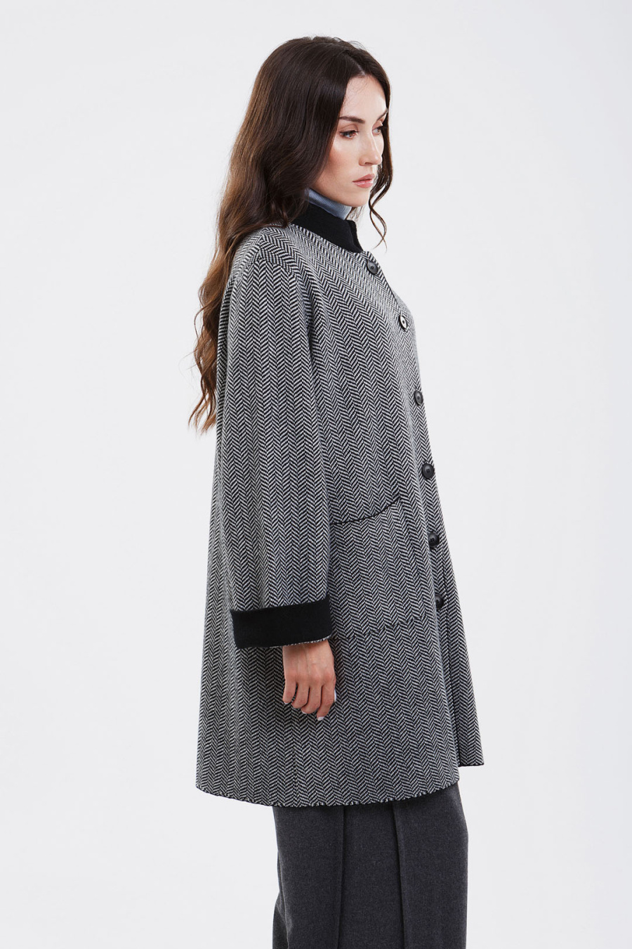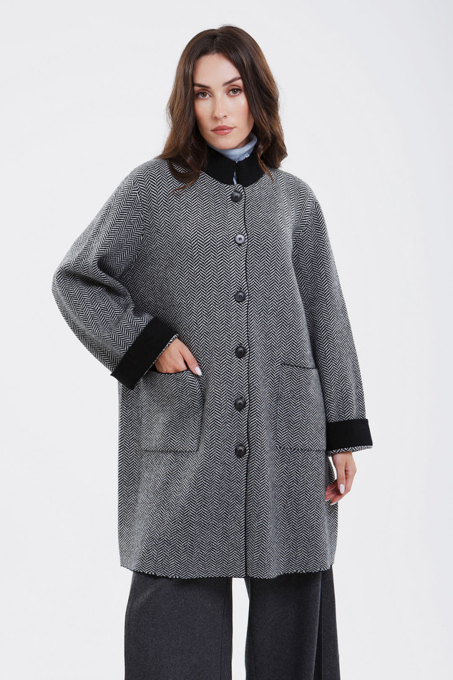 Высокая стойка, которая добавляет образу собранности и гармонии, два накладных кармана для практичности и завершённости, а также классическая застёжка на пуговицы.