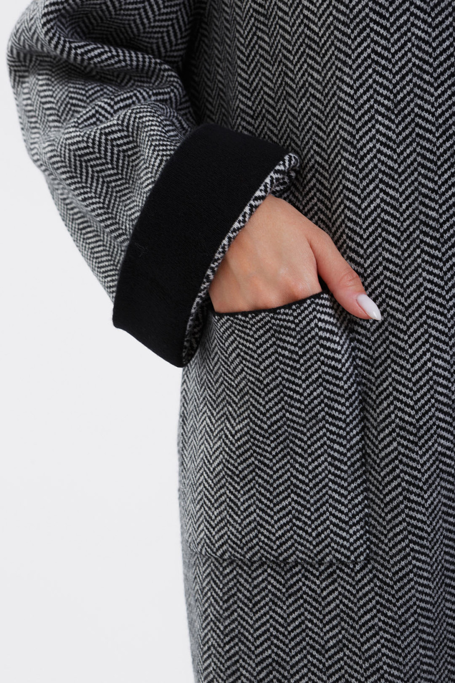 Строгий чёрно-белый принт придаёт модели графичную выразительность и художественную глубину, делая её актуальной как для деловой встречи, так и для светского выхода. Свободная посадка и мягкая драпируемость благородной ткани подчёркивают элегантность силуэта, даря ощущение лёгкости и утончённой невесомости.