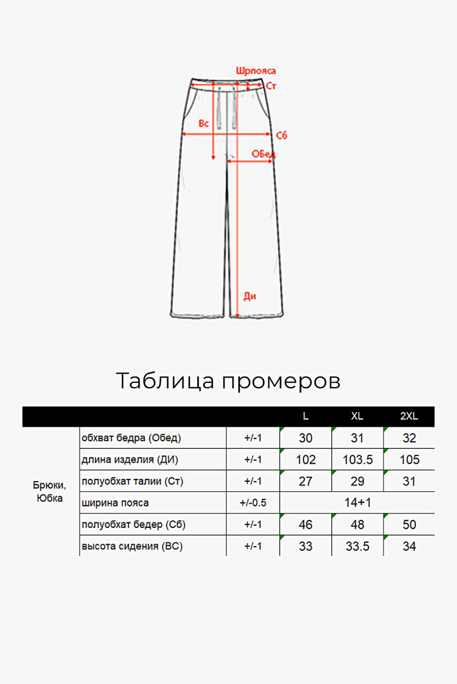 Полуобхват по линии эластичного пояса - 30 см, полуобхват по линии бёдер – 52 см, внешний шов с поясом - 106 см, внутренний шаговый шов - 70 см, ширина низа - 27 см