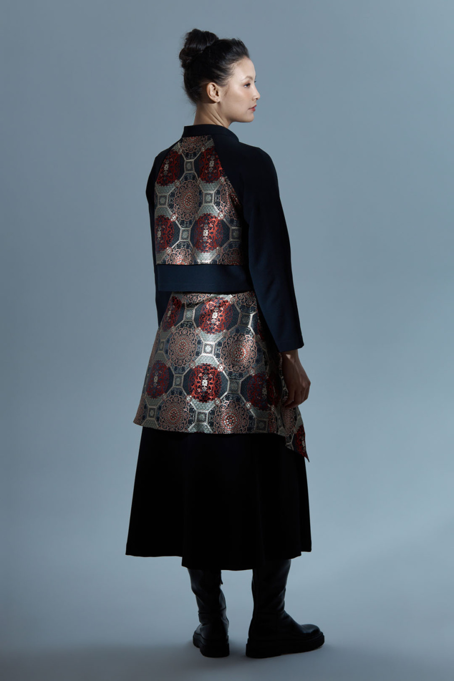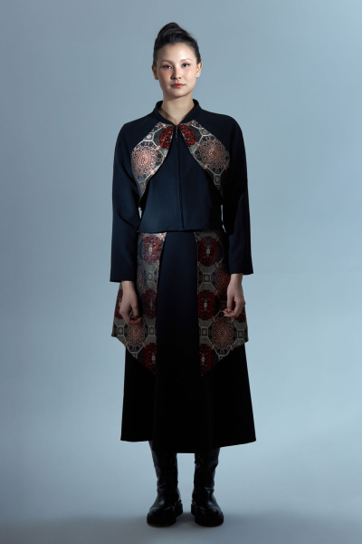 Главная особенность верха — контрастные вставки, стилизованные под бурятский жилет. Это придаёт модели этнический колорит и визуально моделирует фигуру.