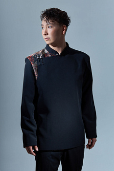 На переде — асимметричная застёжка, направленная на правую сторону. Это не просто конструктивное решение, а знак: правая сторона всегда притягивает всё доброе и правильное. Половина переда из монгольского шёлка. Благородный, мягко мерцающий, выглядывает из под костюмной ткани, создавая эффект сдержанной роскоши.