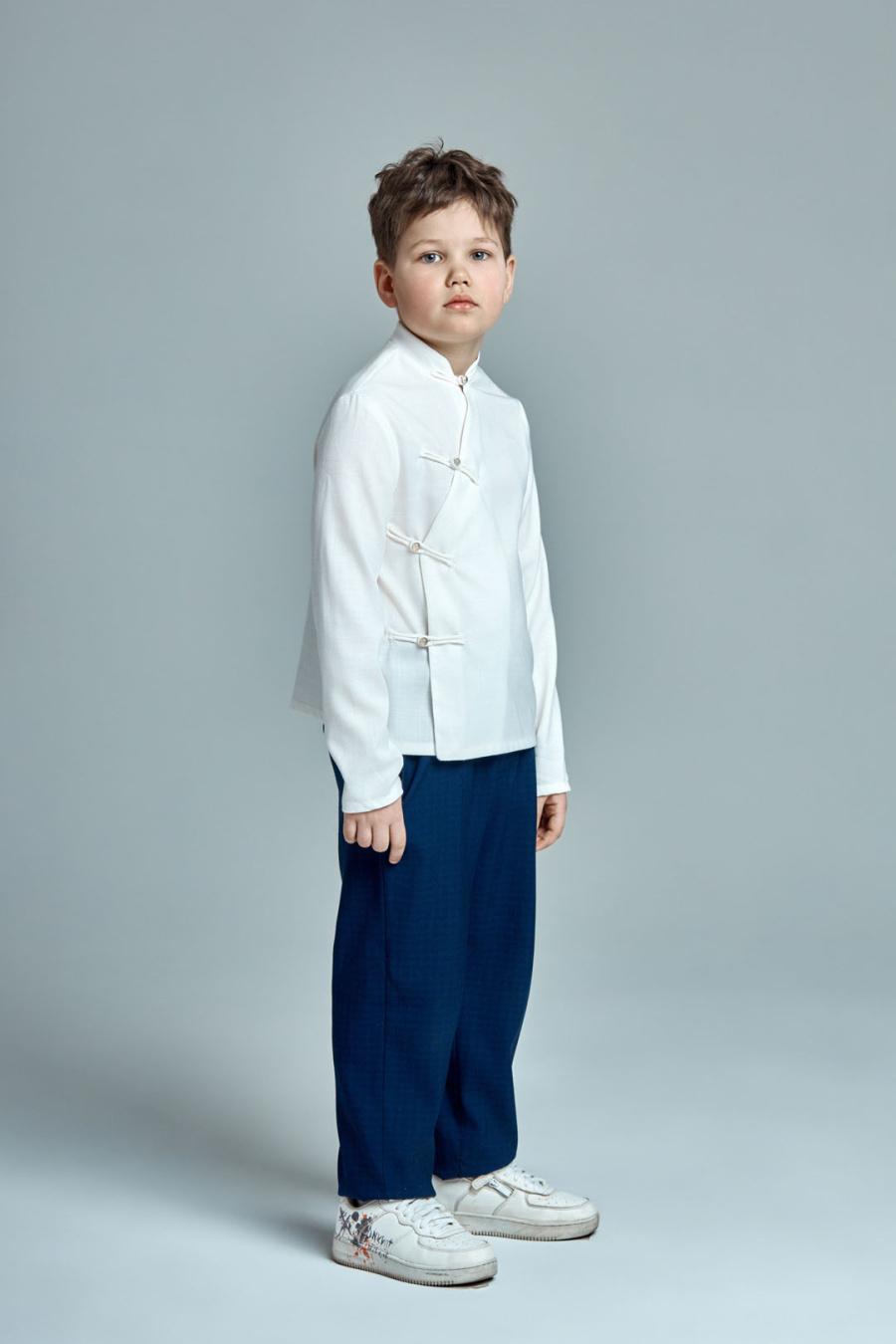 Главная особенность — застёжка, смещённая на правую сторону. Это не только стильный акцент, но и отсылка к традициям, где правая сторона всегда связана с добром и правильным путём. Такая деталь словно оберегает маленького хозяина, напоминая о связи с родом с самых первых шагов.