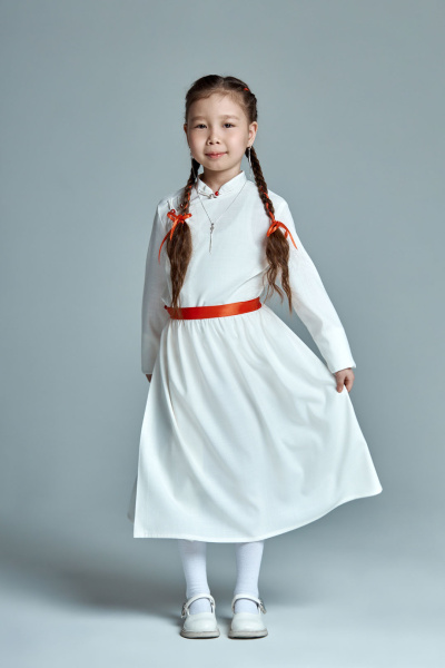 Маленьким хранительницам традиций — платье, в котором живёт память. Эта модель напоминает силуэты старинных бурятских платьев, но звучит современно и свежо.