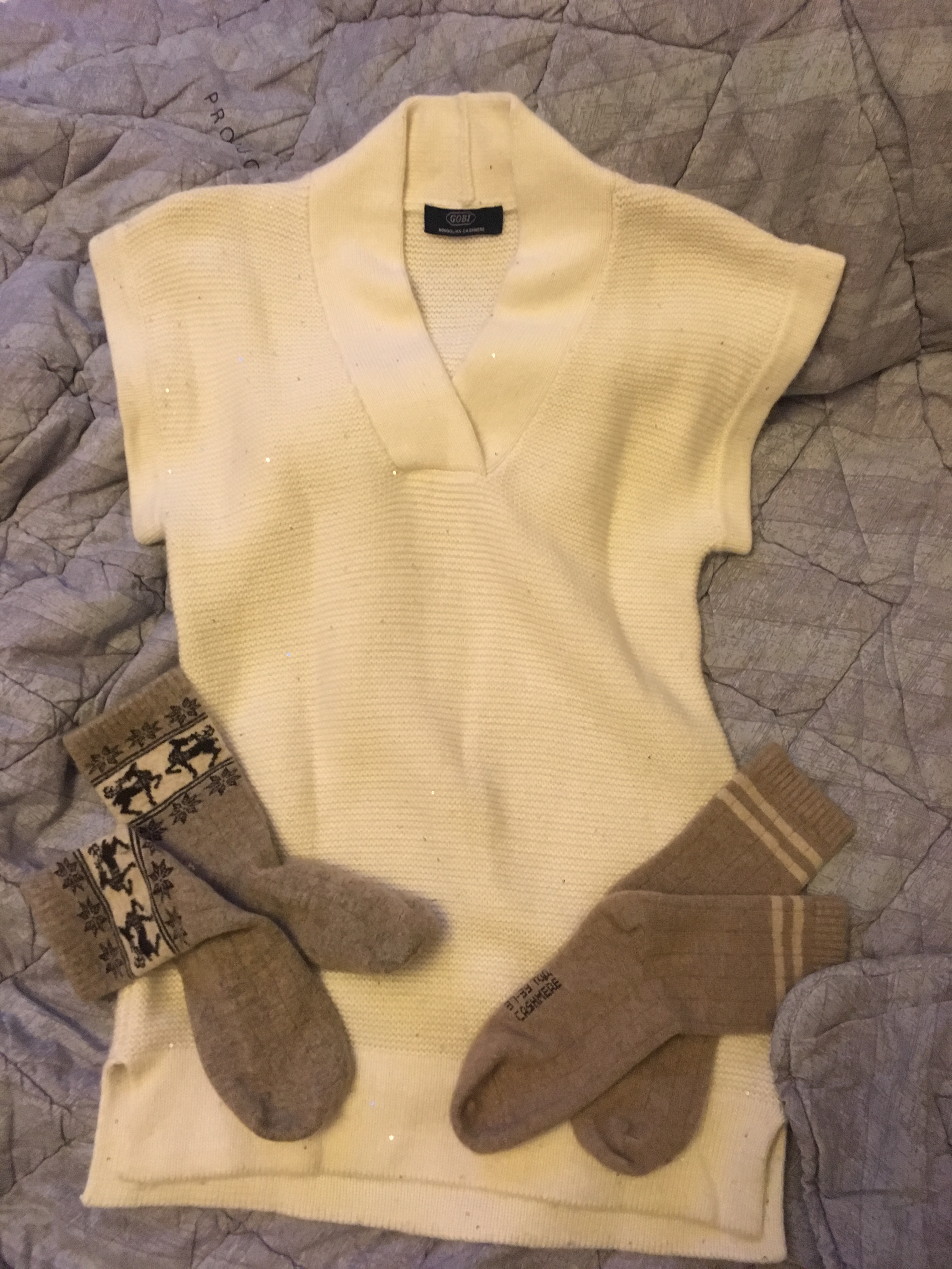 покупала одеяло кашемировое стеганое (т.е. в чехле), одежду фабрики gobi, мелочи разные - носки, тапочки. Все прекрасного качества! одеяло теплое, не шуршит, среднего веса (не как пух, конечно, но и нет тяжести, как в овечьих, например, одеялах). Одежда gobi тоже замечательна - мягкая, приятная и теплая. Носочки снашиваются в пятках, но это норма для носков, зато теплые, не колятся (я брала и кашемировые и овечьи, никакие не колятся). Всеми покупками была довольна)